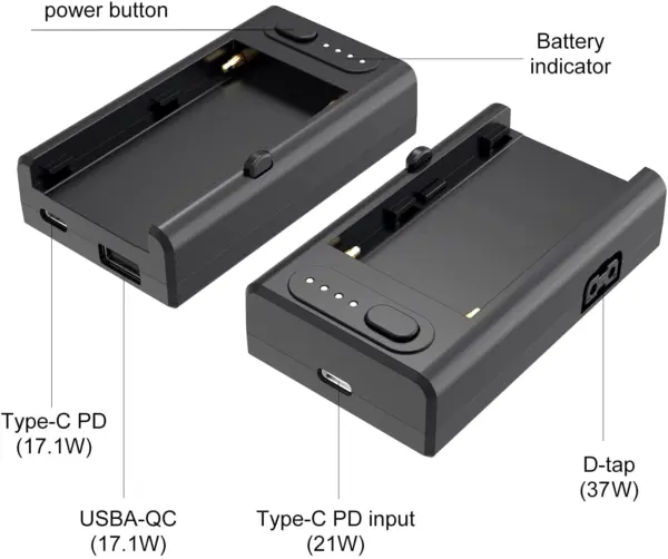 Saídas: USB-C PD, USB-A QC, D-TAP