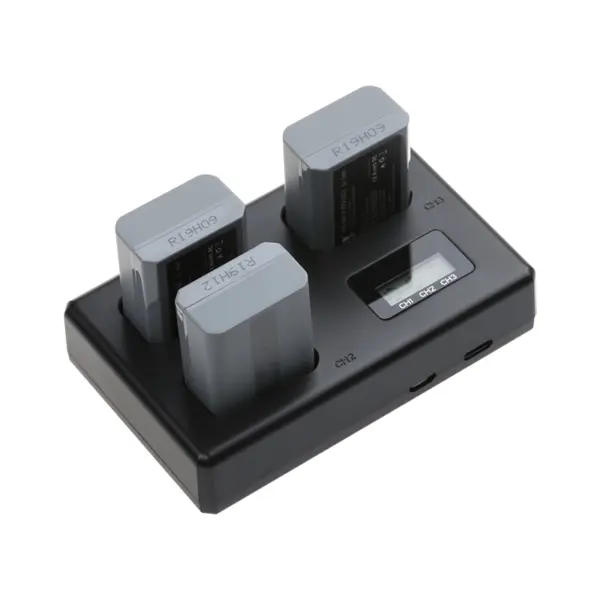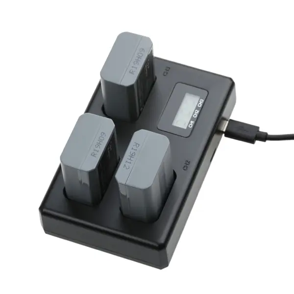 Carregador triplo oferece de carregar 1 – 3 baterias ao mesmo tempo, o display lcd mostra o status do carregamento atual de cada bateria.