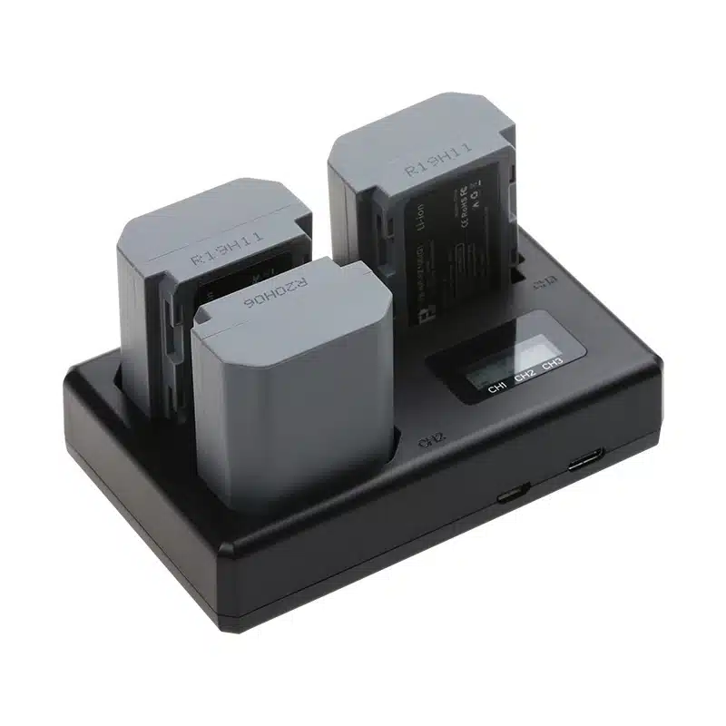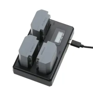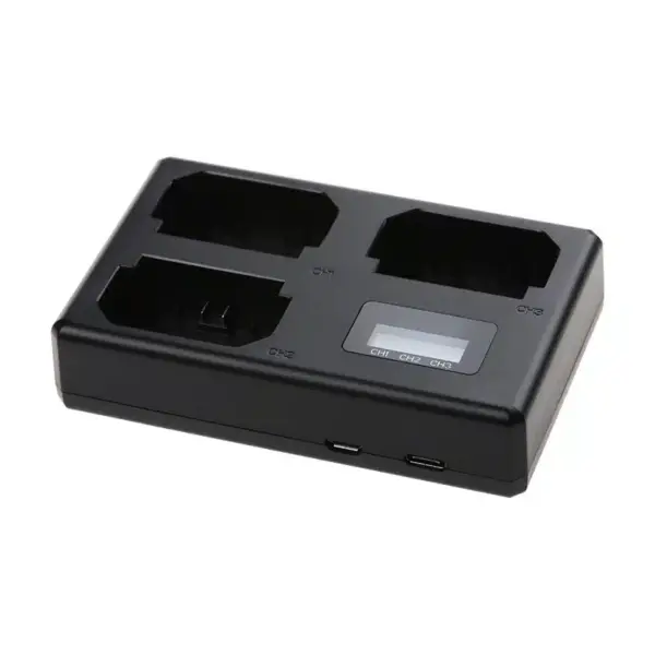 Carregador triplo oferece de carregar 1 – 3 baterias ao mesmo tempo, o display lcd mostra o status do carregamento atual de cada bateria.