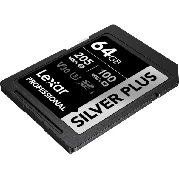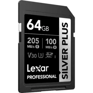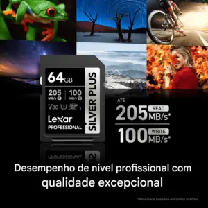 O Cartão SD Lexar 64Gb Silver Plus possui uma capacidade de armazenamento de 64 GB e aproveita o barramento UHS-I para oferecer suporte a vídeos Full HD e 4K/60p. Ele também é adequado para disparos contínuos, disparos rápidos e capturas Raw e JPEG. Este cartão pode atingir velocidades máximas de leitura de até 205 MB/s e velocidades máximas de gravação de até 100 MB/s. Graças à sua classificação de classe de velocidade V30, as velocidades mínimas de gravação são garantidas para não cair abaixo de 30 MB/s.