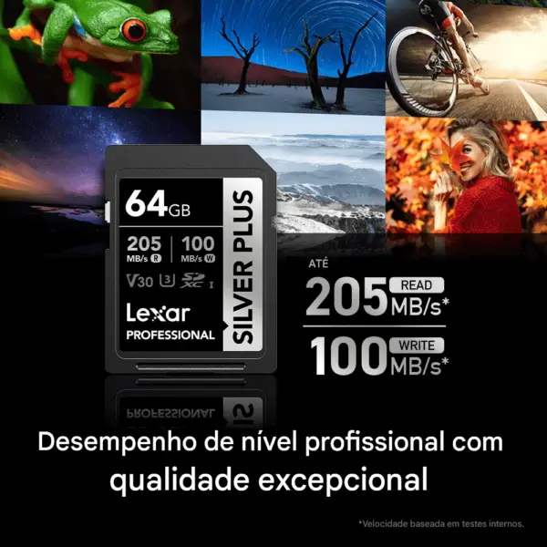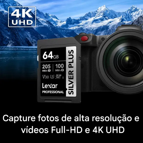 Classificado como V30, o Cartão de Memória SDXC Lexar Silver Plus UHS-I foi criado para gravar fotos em sequência sem perder nenhuma foto e grava suavemente até 4K/60 fps Ultra HD.