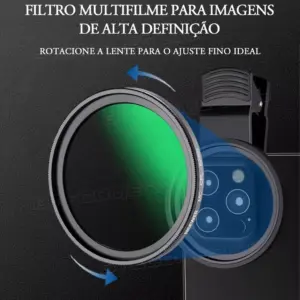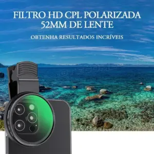 Obtenha fotos mais nítidas, com cores reais e sem reflexos! O Filtro CPL 52mm com Clipe é perfeito para melhorar suas fotos e vídeos no celular, eliminando brilhos excessivos e realçando o contraste natural da cena.