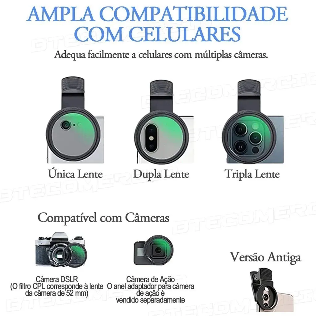 Compatível com todos os modelos de celulares, basta prender o clipe sobre a câmera.