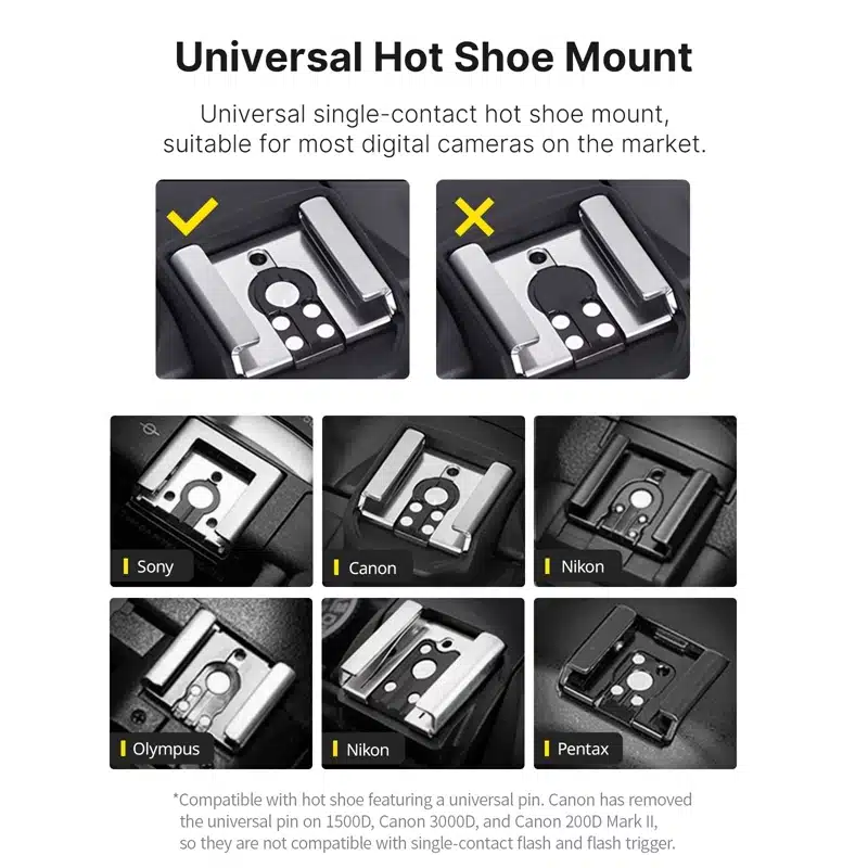 ✅ Compatibilidade Ampla – Funciona com Sony, Canon, Nikon, Panasonic, Olympus e outras câmaras com sapata quente padrão.