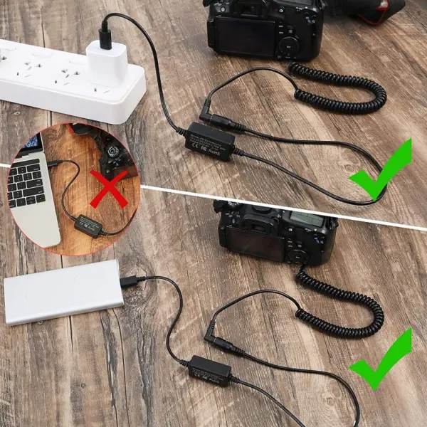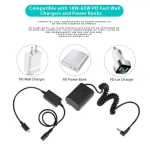 Para usar o adaptador em sua câmera, basta remover a bateria, encaixar o adaptador de bateria no slot da bateria, posicionar o cabo na fenda ou abertura específica que sai do slot da bateria que permite fechar normalmente a tampa da câmera, e conectar o cabo USB-C a uma bateria externa portátil.