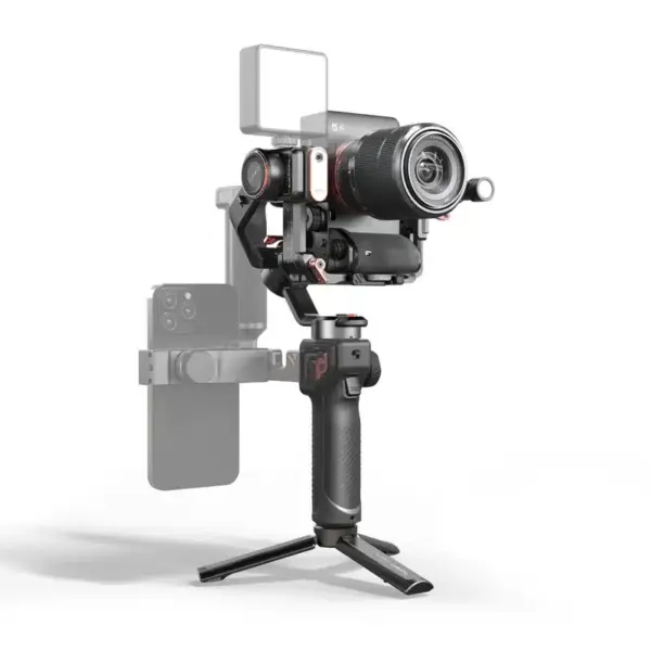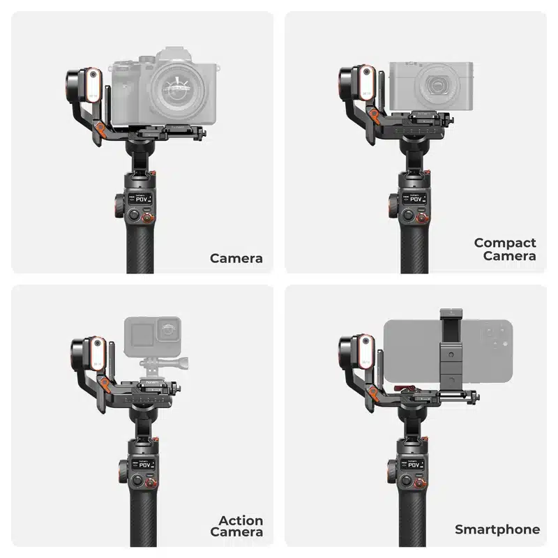 Compatibilidade 4 em 1:Agora suportando até 1,2 kg de carga útil, este pequeno gimbal de câmera é compatível com smartphone, câmera de ação, câmera compacta e DSLR. Compatível com câmeras sem espelho populares, como Sony A7S Ⅲ, Sony FX3, Sony A6000, Canon EOS R5, Canon EOS R8, Nikon Z7Ⅱ, Nikon Z50, etc. *Você pode verificar a lista de compatibilidade de câmeras na visão geral.