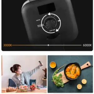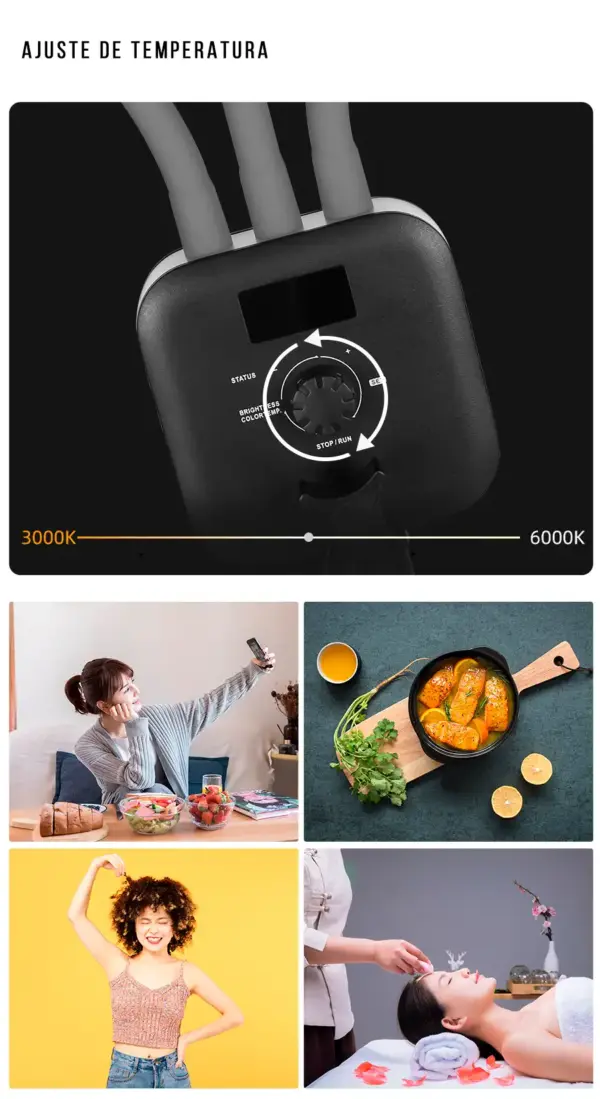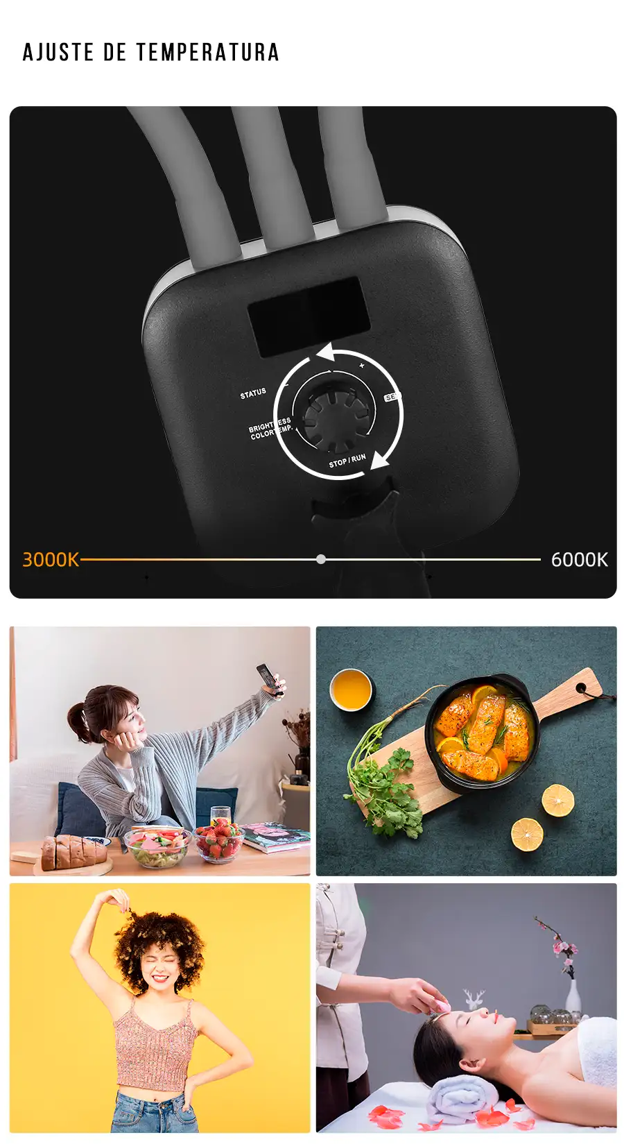 – Visor de temperatura de cor, ajuste 3000k até 5600k.