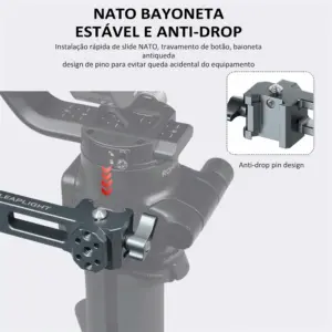 - Compatibilidade com Trilho NATO: O trilho NATO permite a fixação fácil de acessórios adicionais, como monitores, microfones ou luzes, aumentando a versatilidade do gimbal.