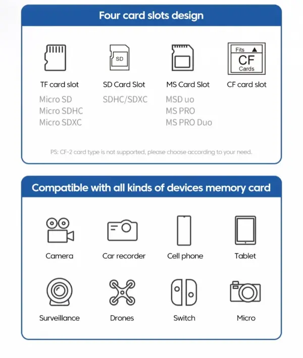 A energia é fornecida através da porta USB C/USB sem a necessidade de energia adicional. Fácil de usar e instalar, nenhuma instalação adicional do software exigida, plug and play. É compatível com cartões de armazenamento SD SDXC SDHC MMC RS-MMC Micro SD TF Micro SDXC Micro SDHC UHS-I