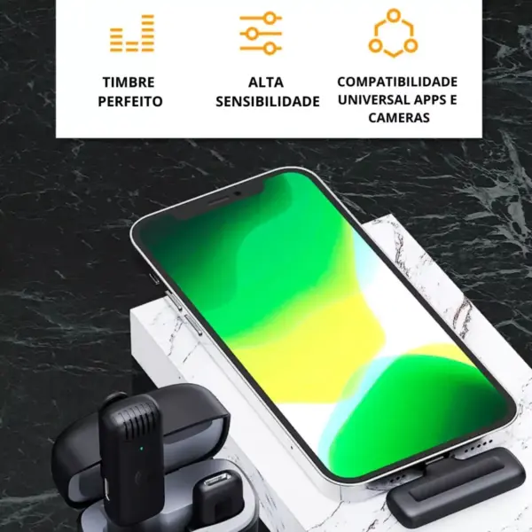 O Microfone Lapela para SmartPhones Apple Lightning de alta sensibilidade com captação de áudio 360 graus, possui resposta rápida para que você grave todos os detalhes de som! Qualidade de som pura, comparável a uma equipe de gravação profissional! Não é necessário aplicativo, basta conectar o Receptor Lightning ao dispositivo de áudio, pressionar rapidamente para ligar o microfone e ele se conectará automaticamente. O Mini Microfone Sem Fio Omnidirecional de 360° pode ser preso ao colarinho para gravação de áudio e vídeo sem as mãos.
