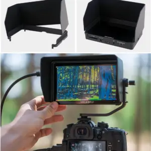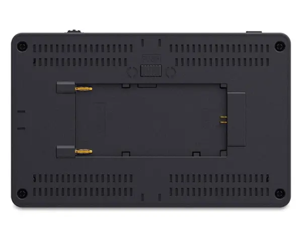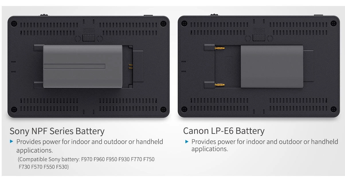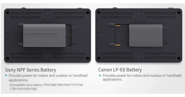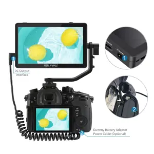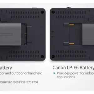 O monitor é alimentado por baterias NP-F550 (incluída) ou compatíveis, com saída DC 8,4V para câmeras através de dummy battery, garantindo flexibilidade no uso em campo. Seu design compacto e leve, com braço de inclinação e montagem 1/4″-20, permite fácil fixação em câmeras, gimbals e rigs.
