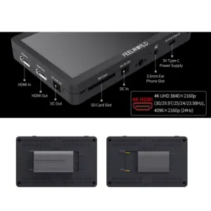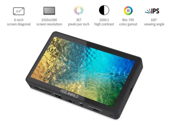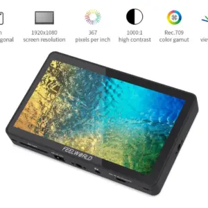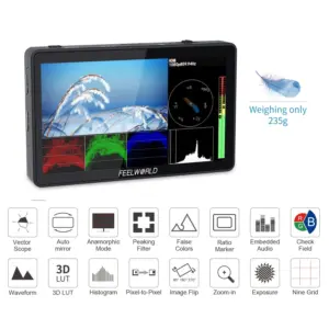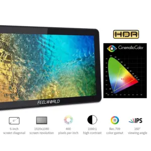 O Feelworld F6 Plus 4K é um monitor de campo de 5,5″ com painel IPS Full HD (1920×1080) calibrado em Rec.709, oferecendo reprodução de cores precisa para aplicações profissionais em vídeo. Suporta entrada HDMI 4K (DCI 4K a 24fps e UHD 4K a 30fps) com saída HDMI em loop para facilitar conexões em cadeia.