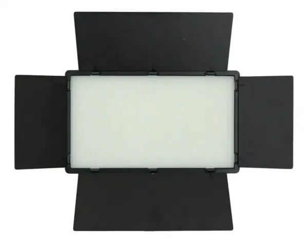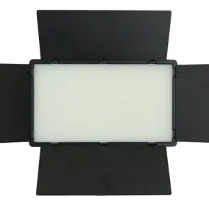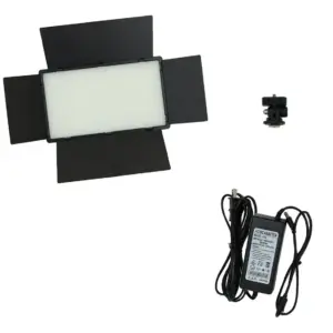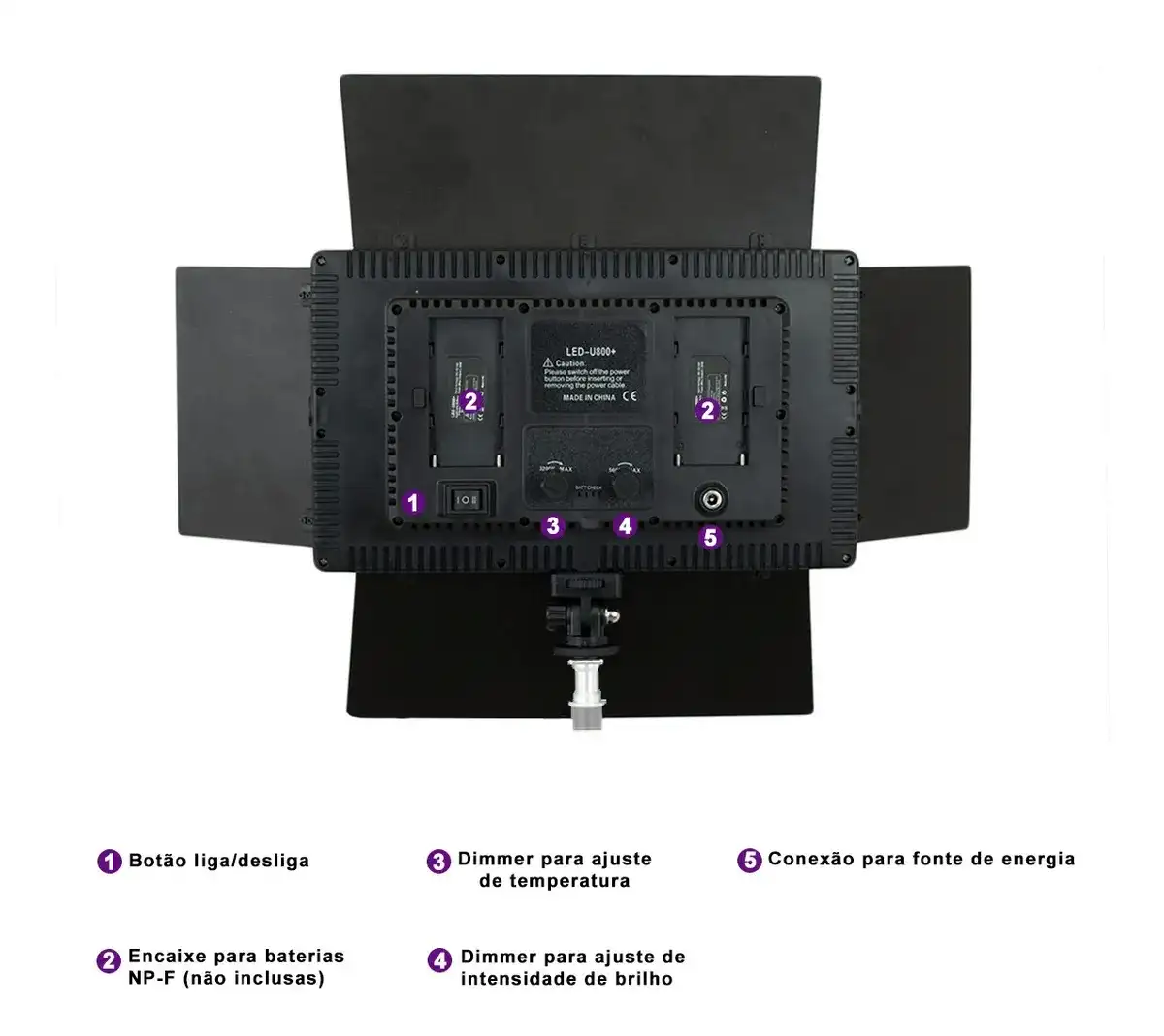 Esse iluminador conta com uma aba barn door embutida e sua alimentação pode ser feita através da fonte de alimentação bivolt DC15V-4A que acompanha esse produto, ou através de duas baterias do modelo NP-F (não inclusas).