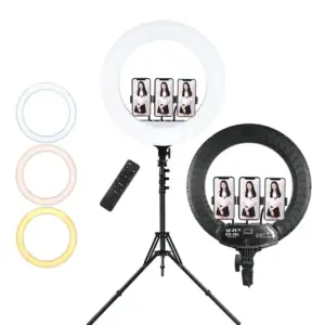 A Ring Light portátil LED de 46cm é a escolha perfeita para quem busca uma iluminação de qualidade profissional. Com um aro de 46 centímetros (18 polegadas) e potência de 55W, essa ring light possui 416 LEDs que oferecem luz ajustável nas cores branco à amarelo. Sua temperatura de cor varia de 3200K a 5500K, permitindo ajustes para criar diferentes ambientes.