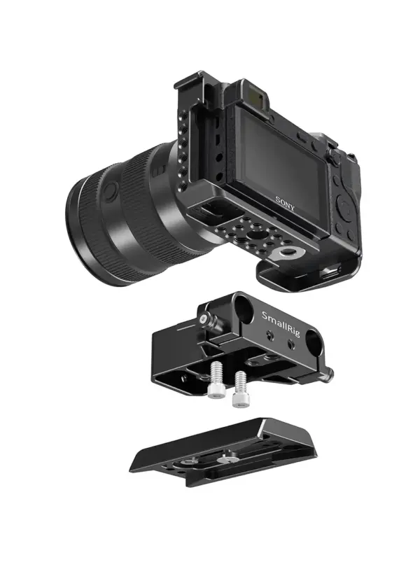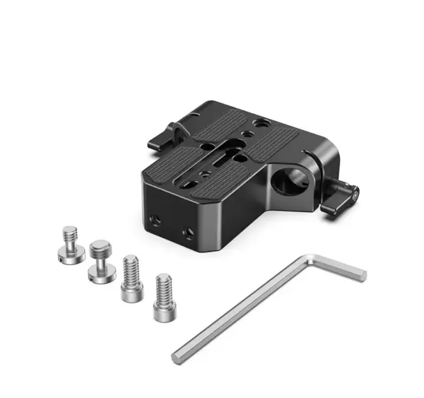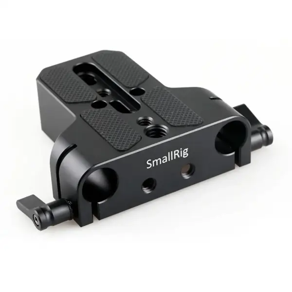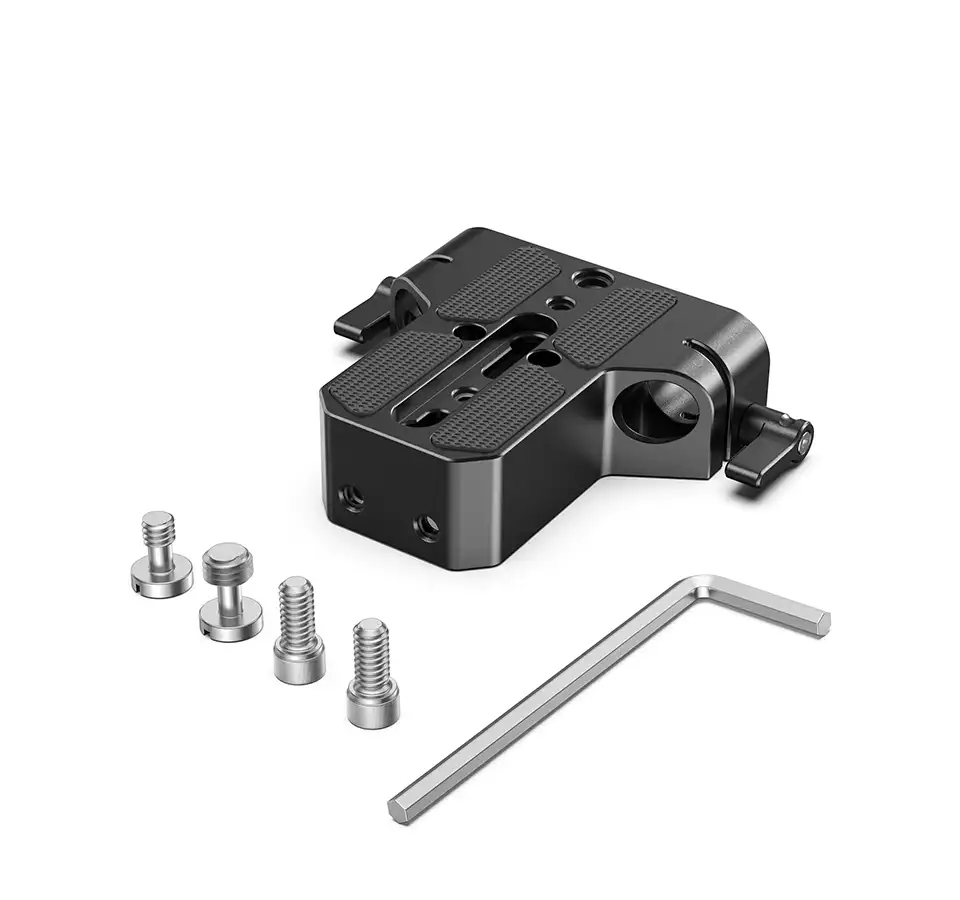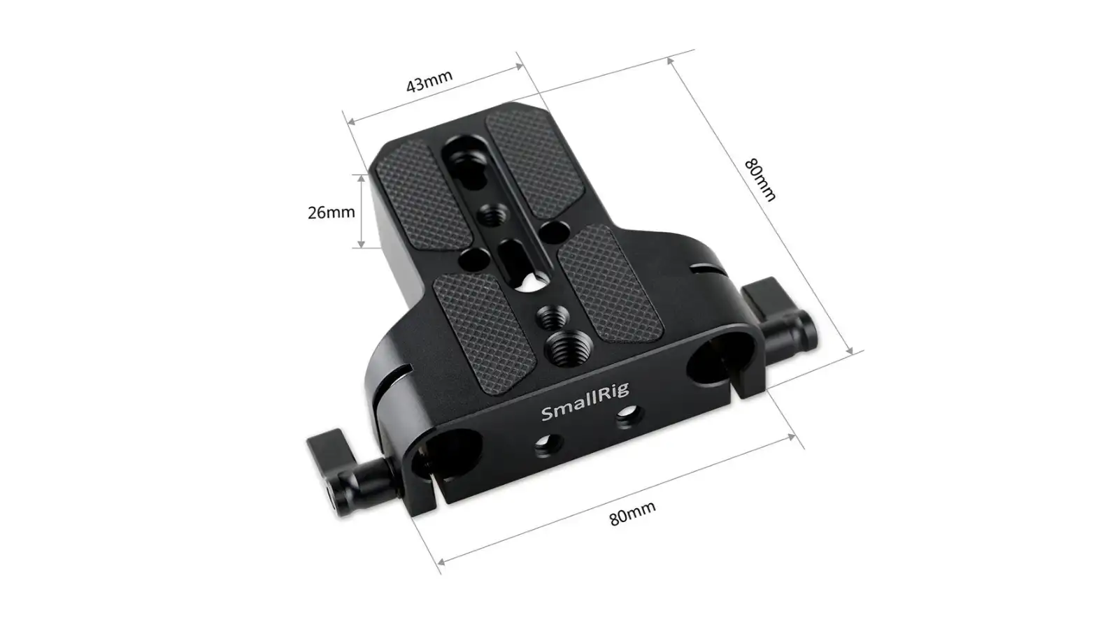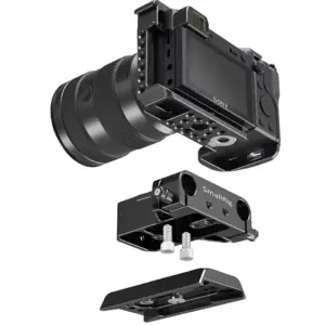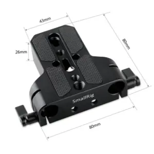 Baseplate SmallRig com furo duplo 15mm Rod Clamp 1674 é uma placa de base simples e leve para as câmeras populares atuais, como Sony FS7, Sony A7, Canon C100 / C300 / C500 etc. É conectada a uma câmera com 3/8 ” Parafuso de 16 ou 1/4 “-20. A placa de base possui orifícios de haste espaçados de 15 mm e 60 mm que permitem montar um foco posterior, caixa fosca, suporte de lente ou outros acessórios. Ele foi projetado especificamente para manter o peso baixo e permitir que o operador use a almofada de ombro embutida do FS7, minimizando a quantidade de peso e equipamentos extras necessários para uma plataforma. Com roscas de 1/4 ” – 20 e 3/8 ” – 16 na parte inferior, esta placa de base pode ser conectada a qualquer tripé.