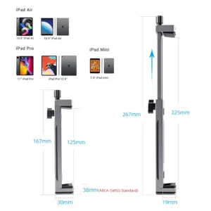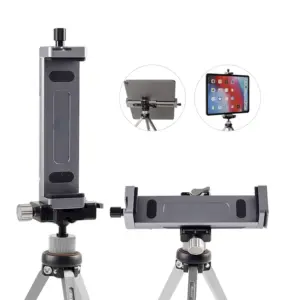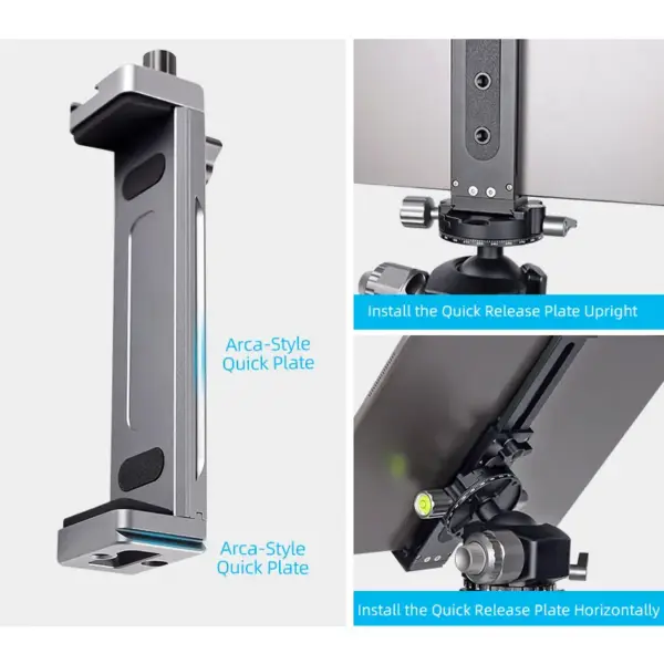Arca-Style Quick Release Plate: Tanto a parte inferior quanto a traseira do tablet Clip têm design Arca Swiss Standard. Você pode instalá-lo diretamente na cabeça do tripé para retrato ou paisagem. Um furo de parafuso 1/4 “na parte inferior e três furos de parafuso 1/4” na parte traseira.