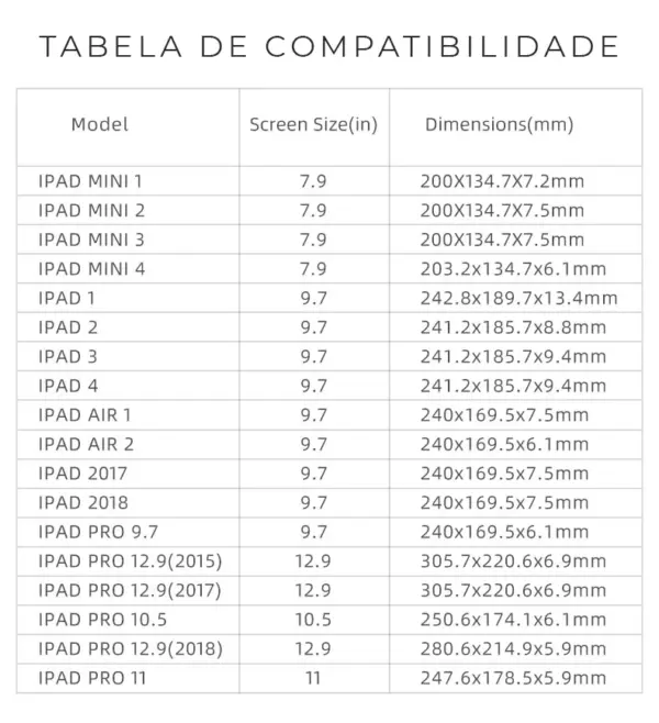 Compatível com: iPad Pro 12.9, 10.5, 9.7, iPad Air, Ar 2, iPad Mini 1,2,3,4, Microsoft Surface 3 10.8, surface Pro, Samsung Galaxy Tab A 7 polegadas/8 polegadas/9,7 polegadas, Samsung Galaxy Tab S3, Dragon Touch X10, A1X Plus, Huawei MediaPad M3 8.0, Asus Transformer Livro 10.1 T100 / T100TA-C1-GR, ZenPad S8 Z580C, ZenPad 10 Z300C, ZenPad 3S 10, Acer iconia Tab, Lenovo ideaTab, google Nexus, Tablet HP/ Sony / Toshiba / Nextbook 7-10.1inch