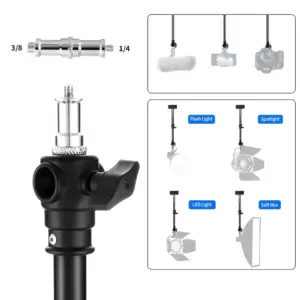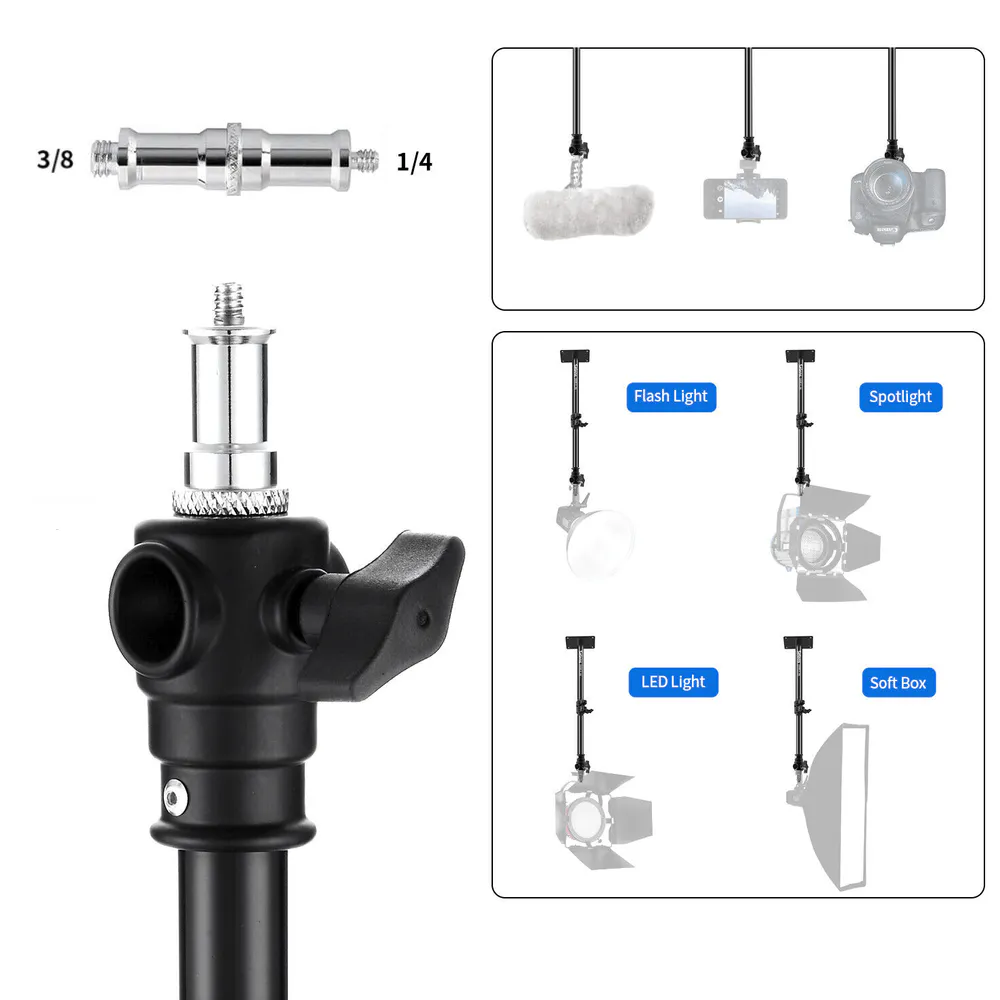 Equipado com roscas padrão 1/4″ e 3/8″, o WT812 é compatível com flashes de estúdio, iluminadores LED e outros acessórios fotográficos. É amplamente utilizado em fotografia e produção de vídeo, especialmente para iluminação aérea ou em ângulo alto, oferecendo maior liberdade de composição e organização do espaço.
